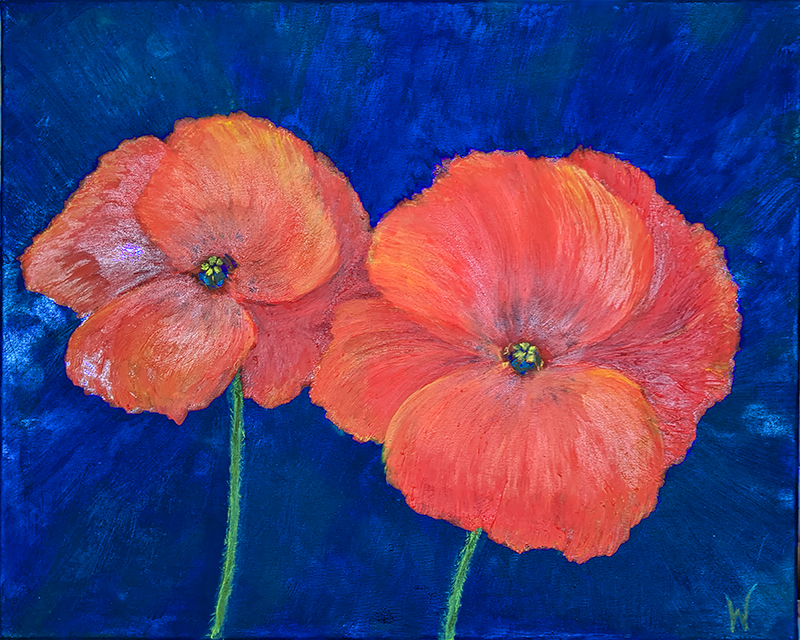 Tweeluik klaprozen B. Twee klaprozen geschilderd op donkerblauwe achtergrond. Olieverf op canvas 50 x 40 x 2 cm.
