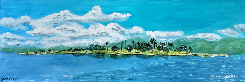 Palmeneiland in het Tobameer, Sumatra, Indonesia. Acryl op canvas, 120 x 40 x 4 cm