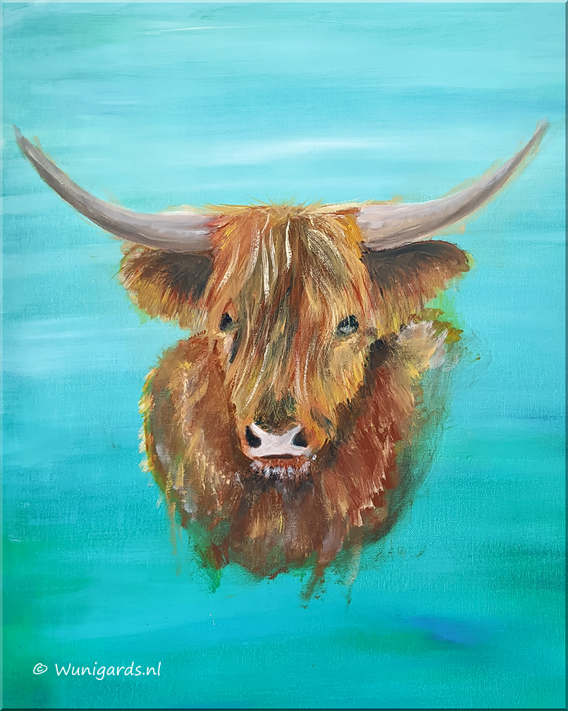 Schotse Hooglander, acryl op doek, ca 40 x 50 cm.